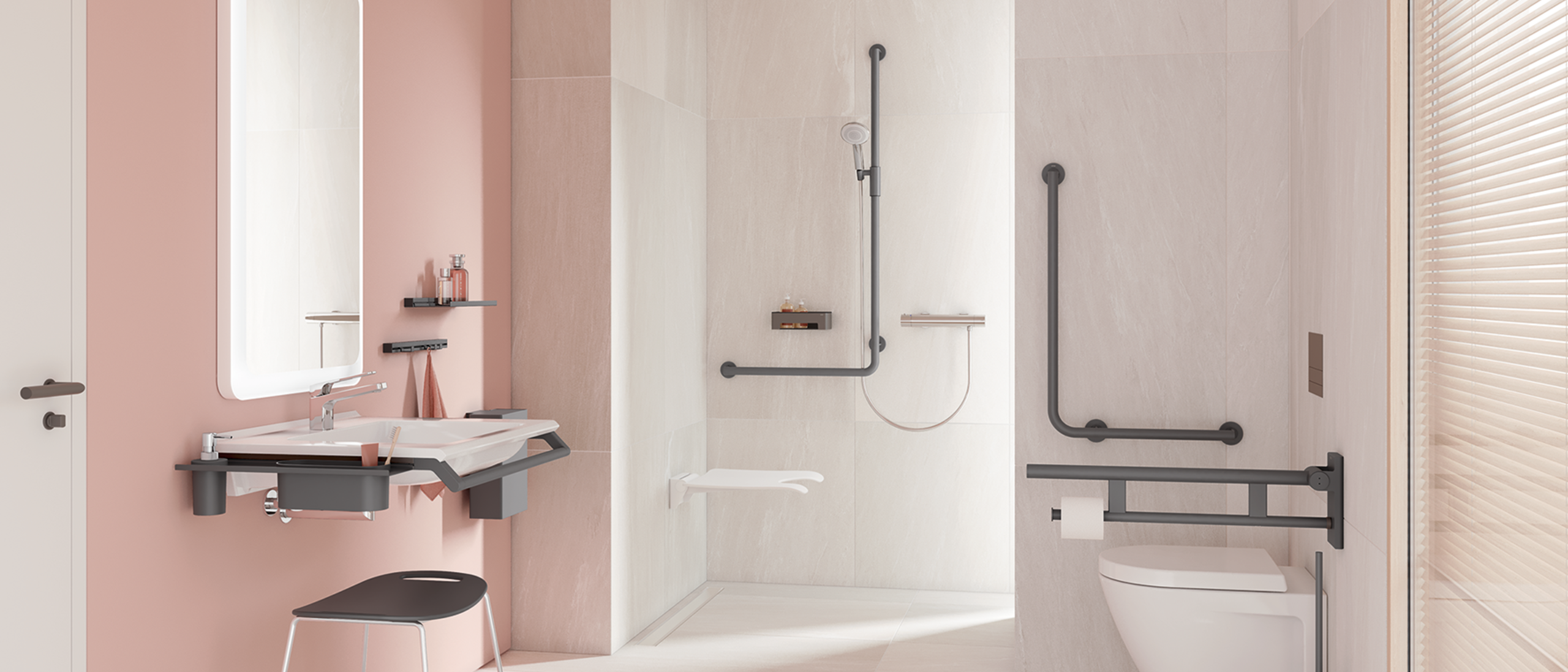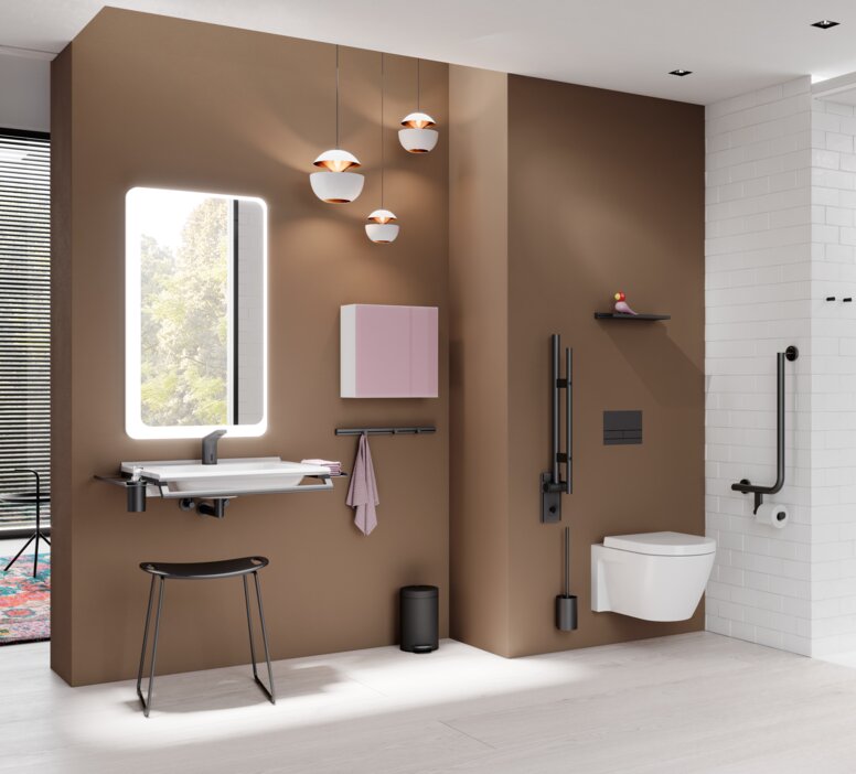 Intelligente Farbgestaltung: Farblich sollten neutrale Töne dominieren, die den Raum optisch vergrößern und für Helligkeit sorgen. Accessoires in kontrastreichen Farben können dabei für Tiefe und Raffinesse sorgen. Das System 900 von HEWI ist beispielsweise in unterschiedlichen Farben erhältlich – von Türdrücker über Haltegriffe, Papierrollenhalter und Bürstenset bis hin zum Waschtischsystem.