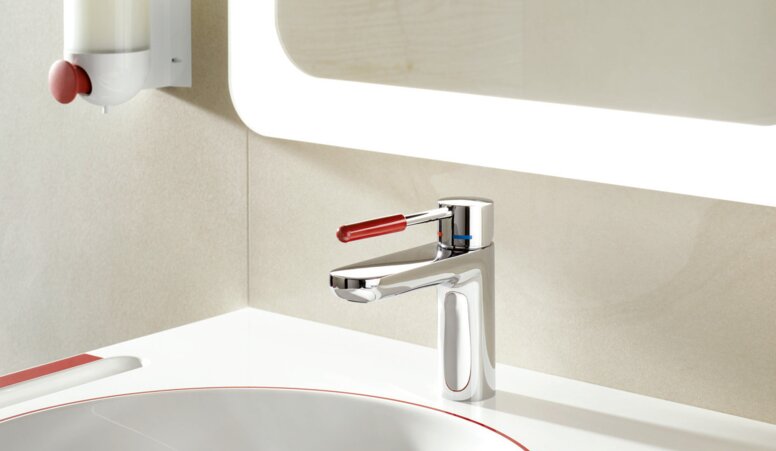 • Einhebel-Waschtischmischer: Einhebel-Armaturen überzeugen durch ihre intuitive und einfache Handhabung. Dank ihrer Heiß-Kalt-Markierung ist die Benutzung und Temperatureinstellung kinderleicht. Mit dem farblich hervorgehobenen Bedienelement der Einhebel-Waschtischmischer in den bekannten HEWI Farben wird der Nutzungsbereich visualisiert und taktil fühlbar gemacht. Das Griffelement besteht aus hochwertigem Polyamid und ist angenehm zu greifen. Dank der Farbvielfalt eignet sich dieses Modell in der Farbe Rot für Demenzerkrankte. Wie sich diese spezielle Farbe auf die Krankheit auswirkt und wie Sie ein Badezimmer für DemenzpatientInnen gestalten, erfahren Sie in diesem Artikel.