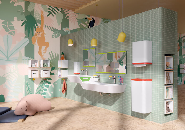 Waschtischarten mit zwei oder mehr Waschplätzen nebeneinander bieten mehreren NutzerInnen gleichzeitig Platz. Die Doppel- und Reihenwaschtische von HEWI sind für den Einsatz in Kindergärten, Kitas und Schulen ausgerichtet. Sie laden durch fröhliche Farben zum Händewaschen ein und unterstützen die spielerische Auseinandersetzung mit dem Element Wasser. Die eingebaute Höhen- und Tiefenabstufung passt sich der Anatomie der Kinder optimal an. Abgerundete Ecken und Kanten schützen vor Stößen und helfen, dass die Armaturen auch für die kleinen Nutzenden gut erreichbar sind. Die Waschtische verfügen über eine porenfreie, pflegeleichte und hygienische Oberfläche. Sogar Acryl- und Fingerfarben lassen sich ohne Rückstände entfernen.