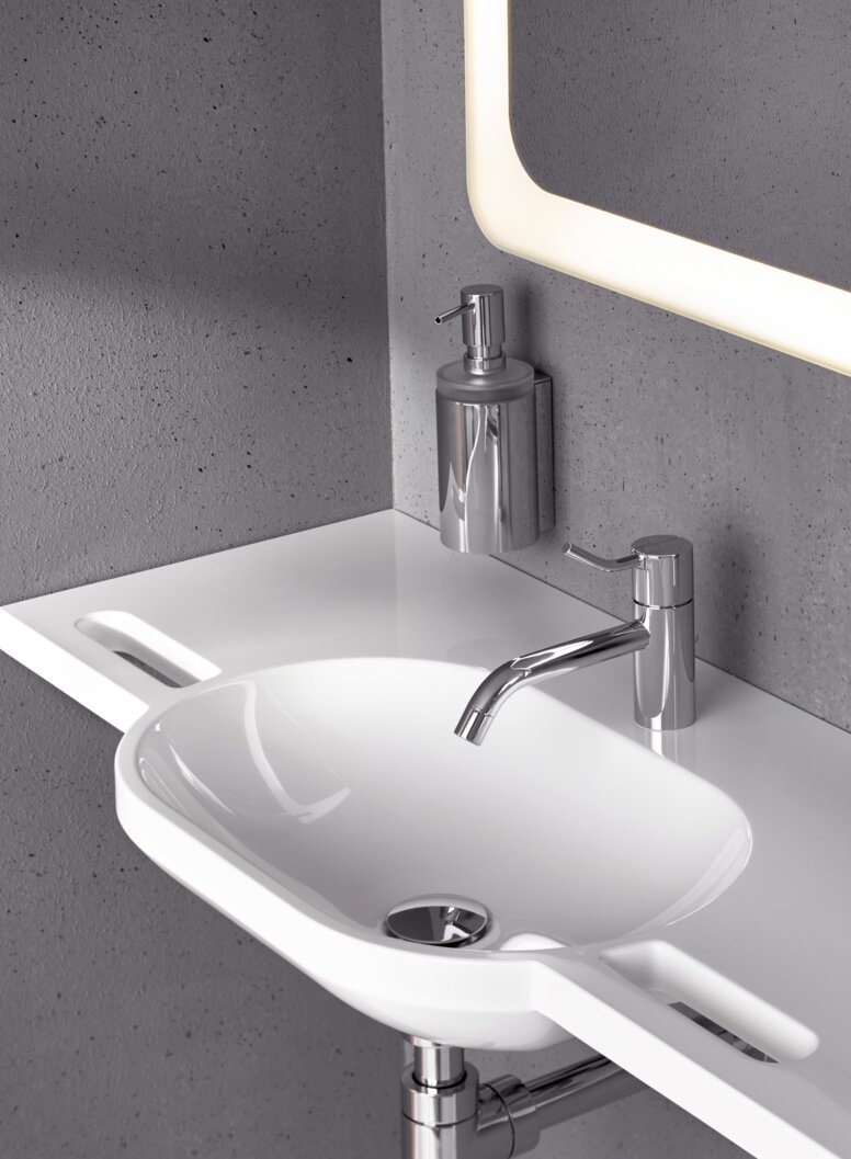 Diese Waschtische vereinen dank ihrer verdeckten Griffkante Design und Funktionalität. Die Griffkante im Frontbereich erlaubt es RollstuhlnutzerInnen, sich selbstständig an den Waschtisch heranzuziehen. Anderen NutzerInnen gibt die untergreifbare Griffkante sicheren Halt und dient bei Bedarf als Halte-, Setz- oder Aufstehhilfe. Dieser Waschtisch verfügt über eine hochglänzende, porenfreie Oberfläche. Diese ist einfach zu reinigen, besonders pflegeleicht und hygienisch.