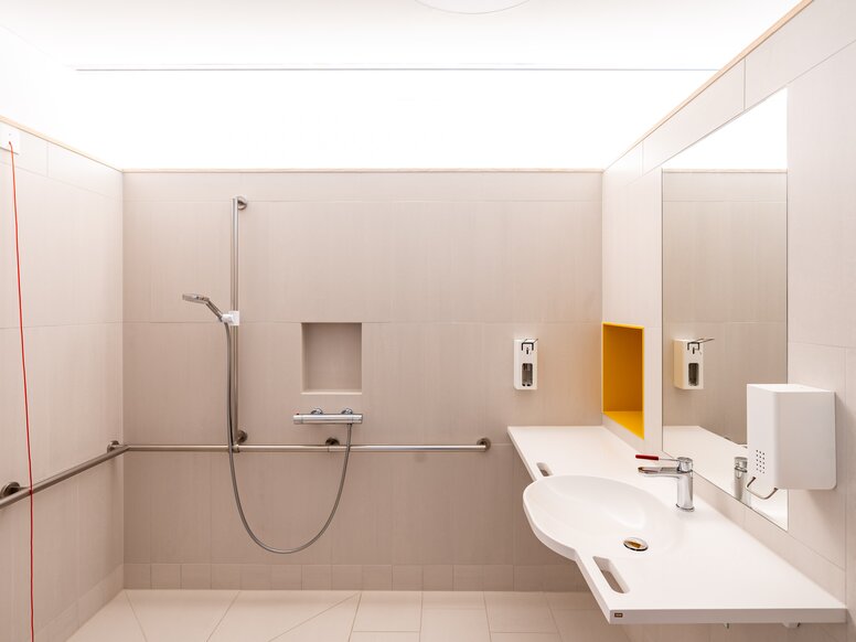 „Mit HEWI konnten wir unsere Bäder individuell planen“, so Stefan Hiebeler. Die neu gestalteten Badezimmer fördern das Wohlbefinden der Patienten und entlasten gleichzeitig das Pflegepersonal, indem sie Selbstständigkeit ermöglichen und Sicherheit bieten.