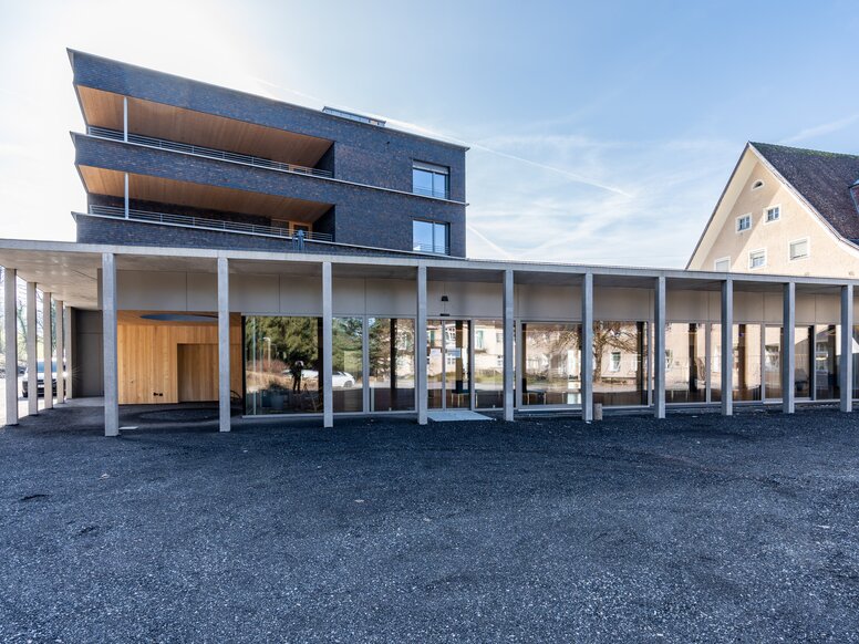 Im Süden des Gebäudeensembles wurde nach dem Abriss des 1980er-Gebäudes an gleicher Stelle das neue Haus Pfänder errichtet, zunächst als zweigeschossiges Bauwerk mit einer tragfähigen Betonkonstruktion. Nach Fertigstellung der beiden Stockwerke wurden die Bewohnenden aus dem temporären Erweiterungsbau in den Neubau umgesiedelt. Schließlich erfolgte der Umzug der 36 Holzmodule. Diese wurden als 2. und 3. OG auf den Neubau aufgesetzt und so an Ort und Stelle wiederverwendet. In nur vier Tagen wurde Modul für Modul mit einem Kran und zwei LKWs transportiert. Die reduzierte Architektur des nun neu entstandenen Gebäudes zeichnet sich durch gerade Linien, große Fenster und eine moderne, dunkle Holzfassade aus und bildet einen bewussten Kontrast zum historischen Hauptgebäude. Auf vier Etagen ersetzen großzügige, offene Aussichtsterrassen die kleinen Balkone des Vorgängerbaus. Großformatige Fenster lassen viel Tageslicht ins Innere und öffnen den Blick in die schöne Natur.
