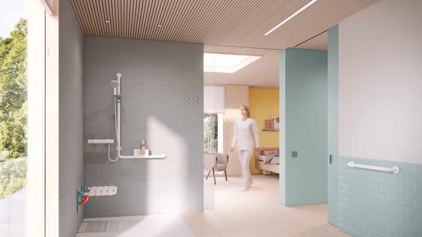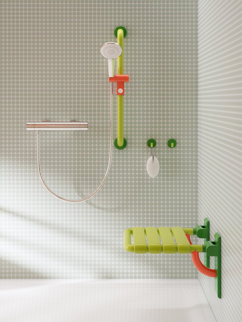 Im Zusammenspiel der unterschiedlichen Komponenten und deren Akzentuierung durch die neue Farbedition Koralle, Aquablau und Reinweiß entsteht im Raum eine Atmosphäre, die anregend und vitalisierend wirkt. Gleichzeitig hat Farbe eine Signalwirkung. Wird ein Produkt durch eine Farbe hervorgehoben, signalisiert der Farbakzent die Nutzung und unterstützt den intuitiven Gebrauch. Das ist ein wichtiger Aspekt, wenn Menschen etwa nicht mehr uneingeschränkt sehfähig sind und beispielsweise durch farblich akzentuierte Produkte eine bessere Orientierung bekommen sollen. Aus all diesen Gründen ist die Tricolor Edition für den Bereich Care, insbesondere Gesundheitsbauten, besonders geeignet.