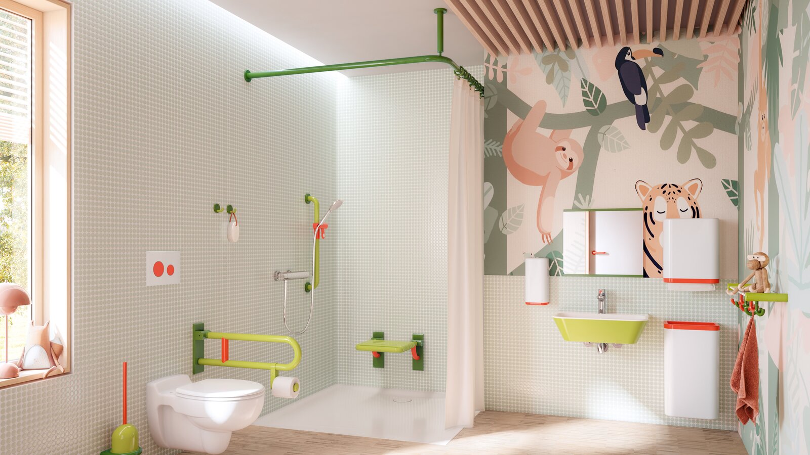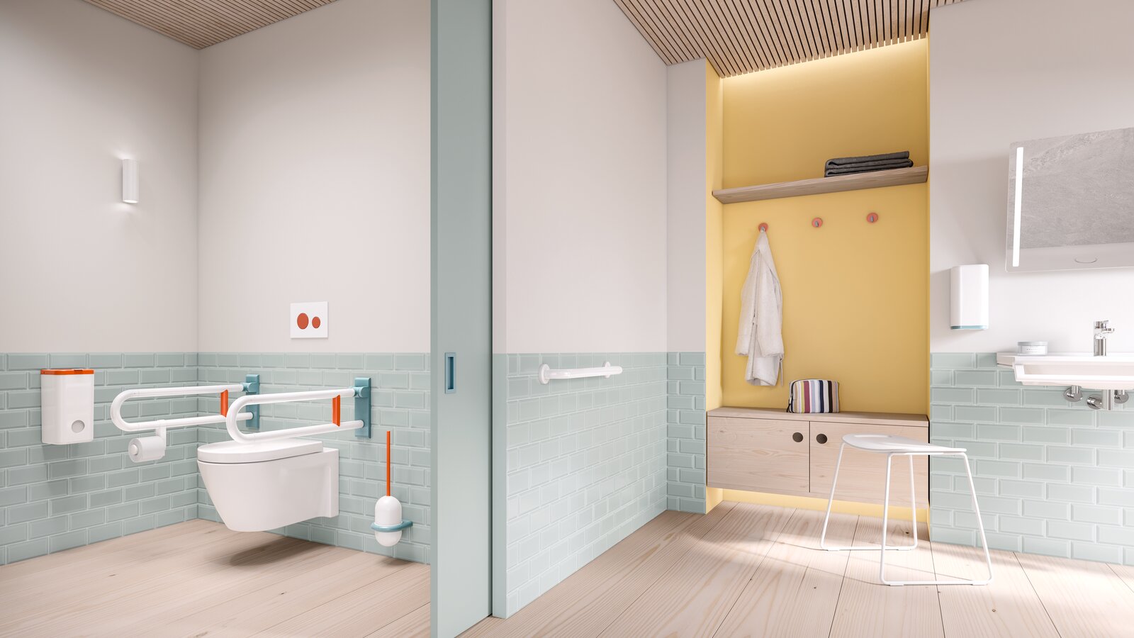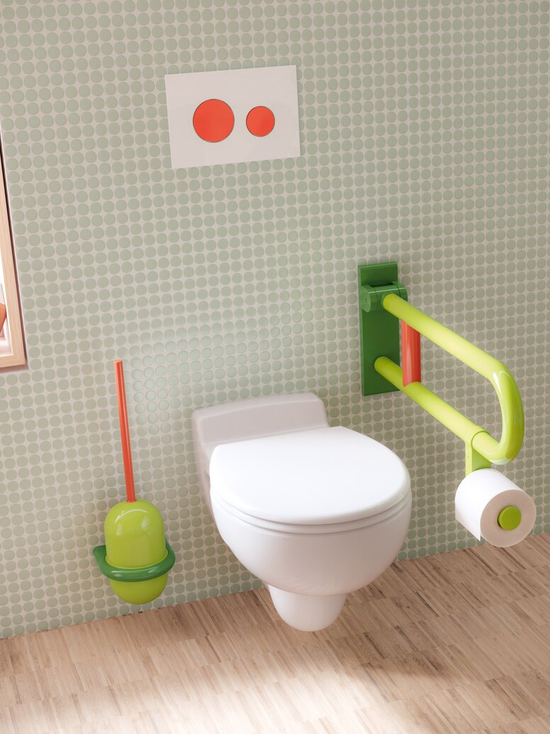 Inspirierende Planungsideen für die Ausstattung von Gesundheitsbauten und Kindertagesstätten: HEWI hat für seine Designikone – die barrierefreie Sanitärserie 477/801 – emotional ansprechende Farbkonzepte entwickelt.
