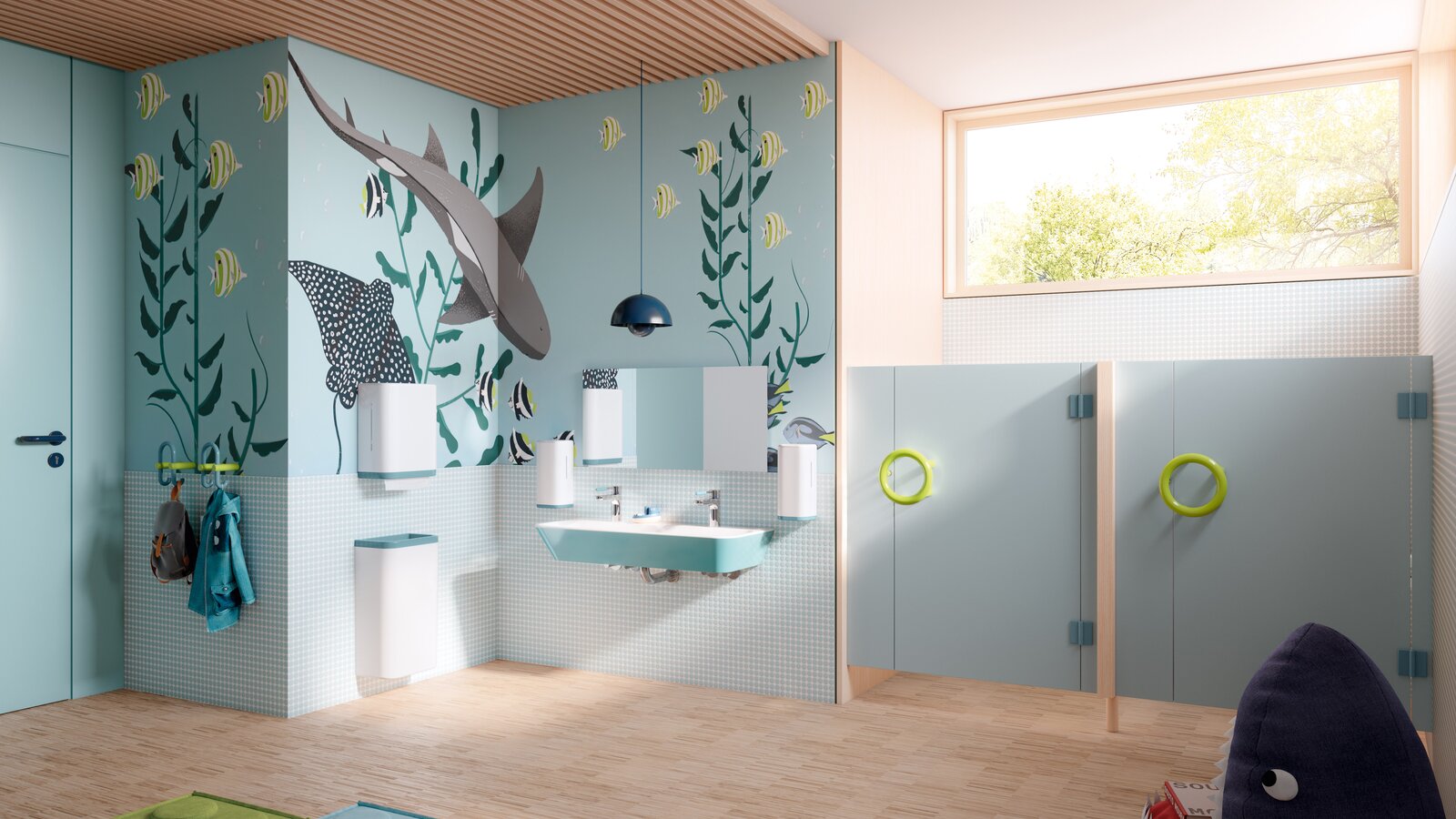 Ein Ort zum Wohlfühlen ist diese Kindertagestätte. Einen erheblichen Anteil an der einladenden Atmosphäre haben die von HEWI eingesetzten Produkte der Serie 477/801 mit der Tricolor Farbedition Apfelgrün, Maigrün und  Koralle.