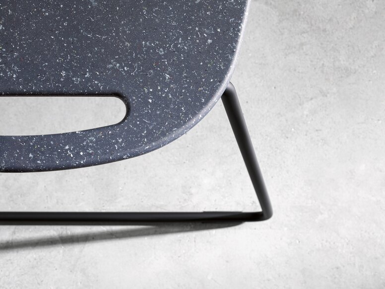 Durch den Materialmix aus rezykliertem Polypropylen und rezykliertem Polyamid, wirken die leicht melierten Oberflächen mit ihrer jeweils einzigartigen Musterung und durchscheinenden Farbtupfern lebendig und individuell. Dabei verringert die Verwendung von rezykliertem Material nicht nur den Kunststoffabfall, sondern macht jede Sitzfläche und jede Armlehne zu einem Unikat.