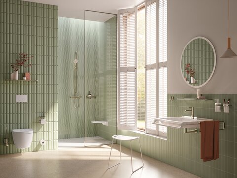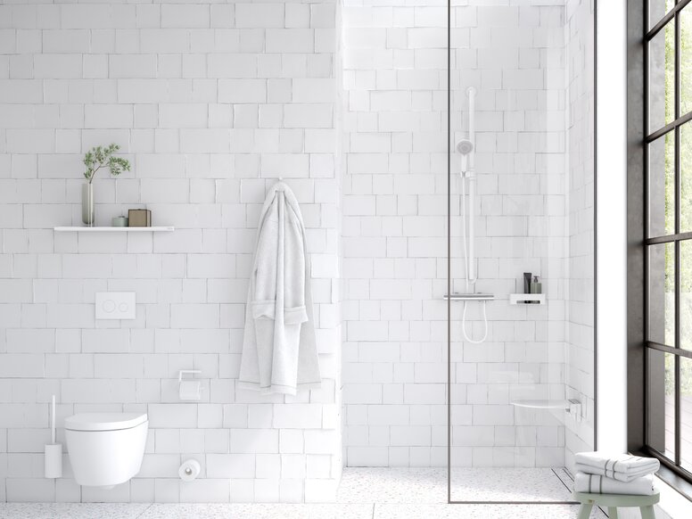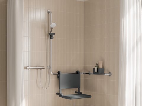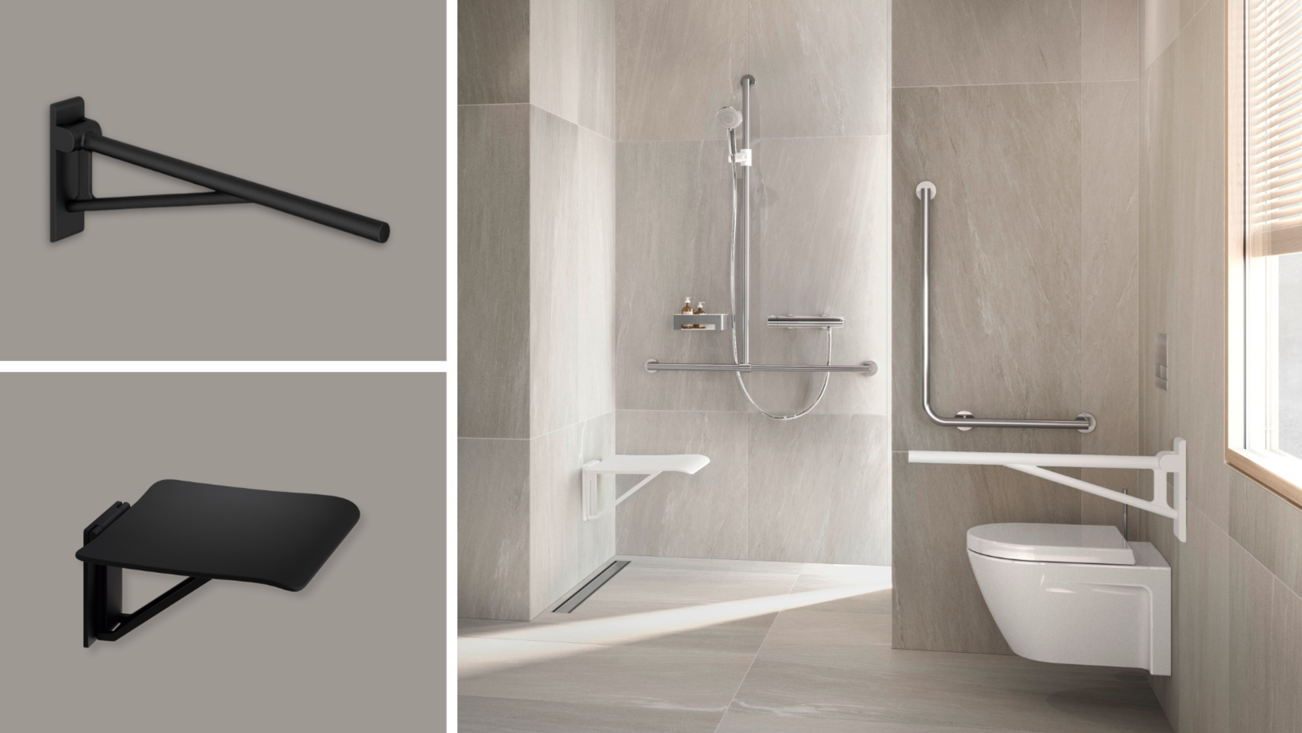 System 162 lässt sich ideal mit den Universalprodukten in klassischem Schwarz und Weiß kombinieren. Die Farbvarianten eröffnen vielfältige Gestaltungsmöglichkeiten, die sich harmonisch in jedes Badezimmer einfügen lassen. Der hochklappbare Duschsitz und der Stützklappgriff bieten höchsten Komfort und Sicherheit und passen sich flexibel an unterschiedliche Bedürfnisse an.
