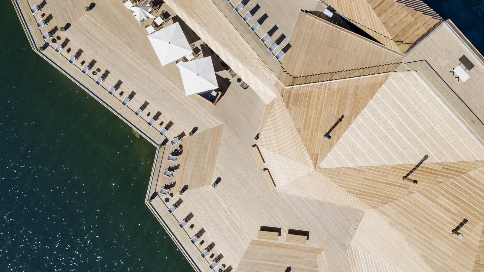 Umgeben wird dieser schwarze Kasten von einer Hülle aus symmetrisch angeordneten Holzstreben. Diese haben gleich mehrere Funktionen. Sie bieten den Besuchern Schutz vor ungewollten Blicken. Schränken den Blick aus dem Inneren auf das Meer aber nicht ein. Zum Meer hin flacht das Gebäude ab und bietet den Besuchern eine Aussichtsterrasse. Teilweise liegt diese auf dem Wasser, so dass man unter den Füßen das Rauschen des Meers hören kann.