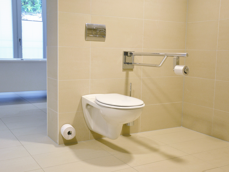 Nicht nur in die Ausstattung des Gebäudes wurde investiert, sondern auch in die Lebensqualität, die das hochwertige Ambiente bietet. So wurde in den Bädern Halte- und Stützklappgriffe installiert, die den Bewohnern Sicherheit geben und sie in ihrer Selbstständigkeit unterstützen. Als Material wurde WARM TOUCH gewählt – hierbei handelt es sich um Polyamid-Produkte, die chromoptisch beschichtet werden. Sie haben die Anmutung von hochglänzendem Chrom. Die Halte- und Stützklappgriffe weisen im Gegensatz zu Produkten mit einer metallenen Oberfläche eine warme Oberfläche auf, sodass sie auch für Menschen mit erhöhter Kälteempfindlichkeit, wie beispielsweise bei Rheuma-Patienten, angenehm zu greifen sind.