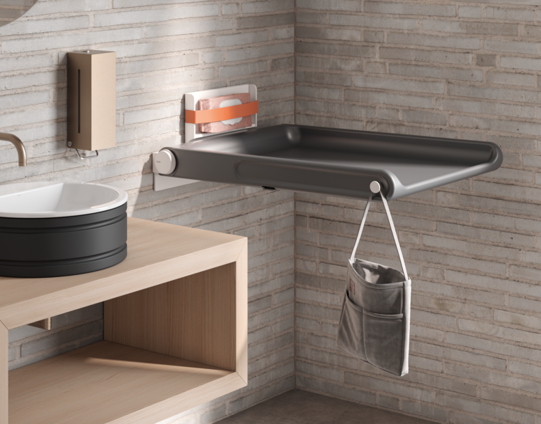 The new HEWI baby changing table combines an easy-to-clean lying surface made of PUR foam in iron grey with robust metal components in matt grain white. The braked fold-down function enables smooth handling, while side hooks and a clamp compartment offer additional comfort and convenience. The changing table combines the highest safety standards and comfortable handling with a modern design that blends seamlessly into public sanitary areas. The baby changing table was designed by Holscher Design, a renowned and award-winning strategic product design agency from Denmark with over 50 years of experience.