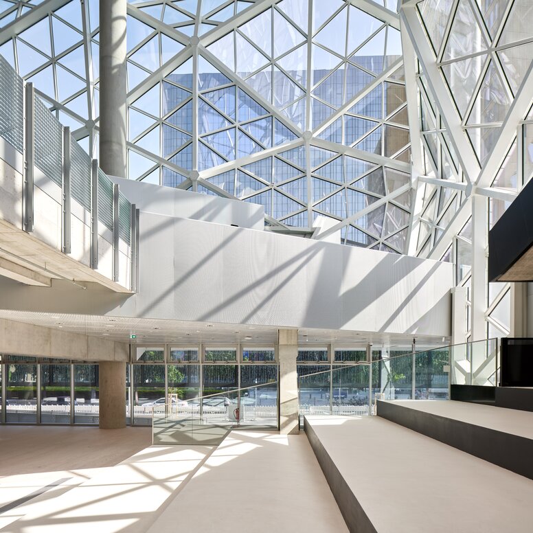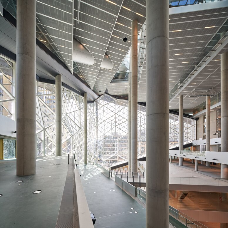 Opulente à souhait et pourtant pas hors du temps, cette accélératrice du changement culturel fait forte impression. Les surfaces de verre teintées foncées sont interrompues par des éléments plus clairs en optique 3D. Des colonnes filigranes soutiennent de larges plafonds en porte-à-faux ; des ponts, des escaliers et des couloirs relient les différents niveaux.